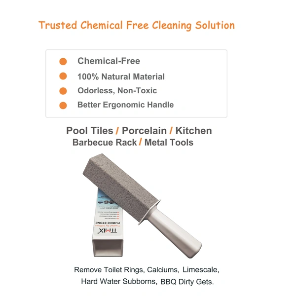 pumice stone removes lime, rust and stains when chemicals quit. Safe for hands and to use around children